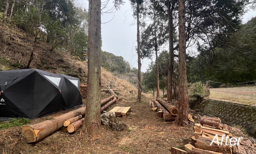 2026.02.07 環境配慮型サウナ場づくり サウナ場づくり 工事内容 :光通し風通しのための植林針葉樹伐採(間伐)/伐採した木の枝葉で乾燥した法面を保護 /伐採した木材の活用(テーブル・椅子・薪づくり) /川へ降りる道づくり(石階段施工) /笹刈り 【工事概要】 「川沿いにサウナ場を設けたい」というご希望を叶えるべく、環境に配慮し、人が集まってきやすいワクワク感を感じられるような施工を行った。 【工期】 10日