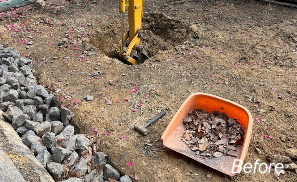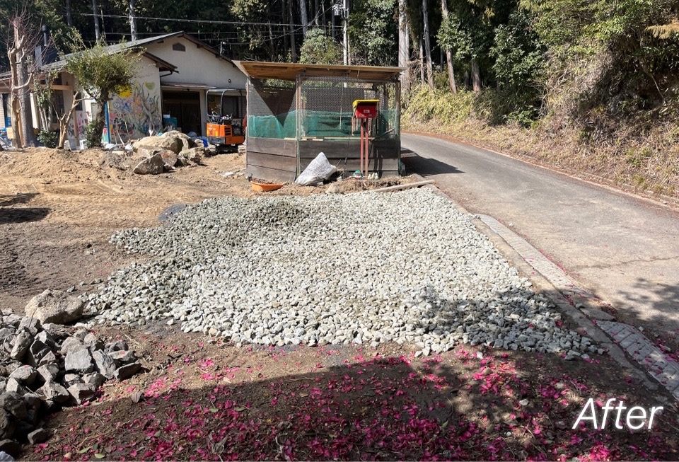 2026.02.05 浸透型緑化駐車場整備 浸透型緑化駐車場整備 工事内容 :すきとり、不陸整正、路盤下地通気浸透処置、敷地境界の浸透型排水処置 【工事概要】 従来のコンクリートやアスファルトの駐車場は、雨水がU字溝に集中し一気に排水されるのが一般的であるが、今回の駐車場整備では、雨庭のようにゆっくりと地中に水を浸透させる機能を持たせることで、自然の循環を損なわない施工を行った。 【工期】 2週間